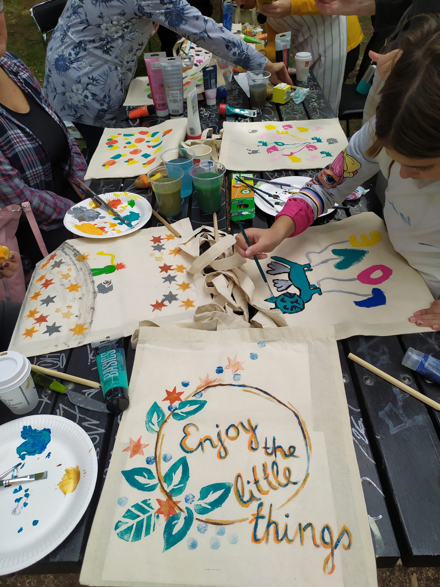 Polaznice radionice ukrašavale su platnene vrećice raznim detaljima i dezenima, pri čemu su ponovno iskazale zavidnu dozu kreativnosti. Posebno tu ističemo naše najmlađe sudionice, čiji su radovi, a nečiji i ljubimci, postali prave zvijezde radionice a privukli su pažnju i slučajnih prolaznika :)